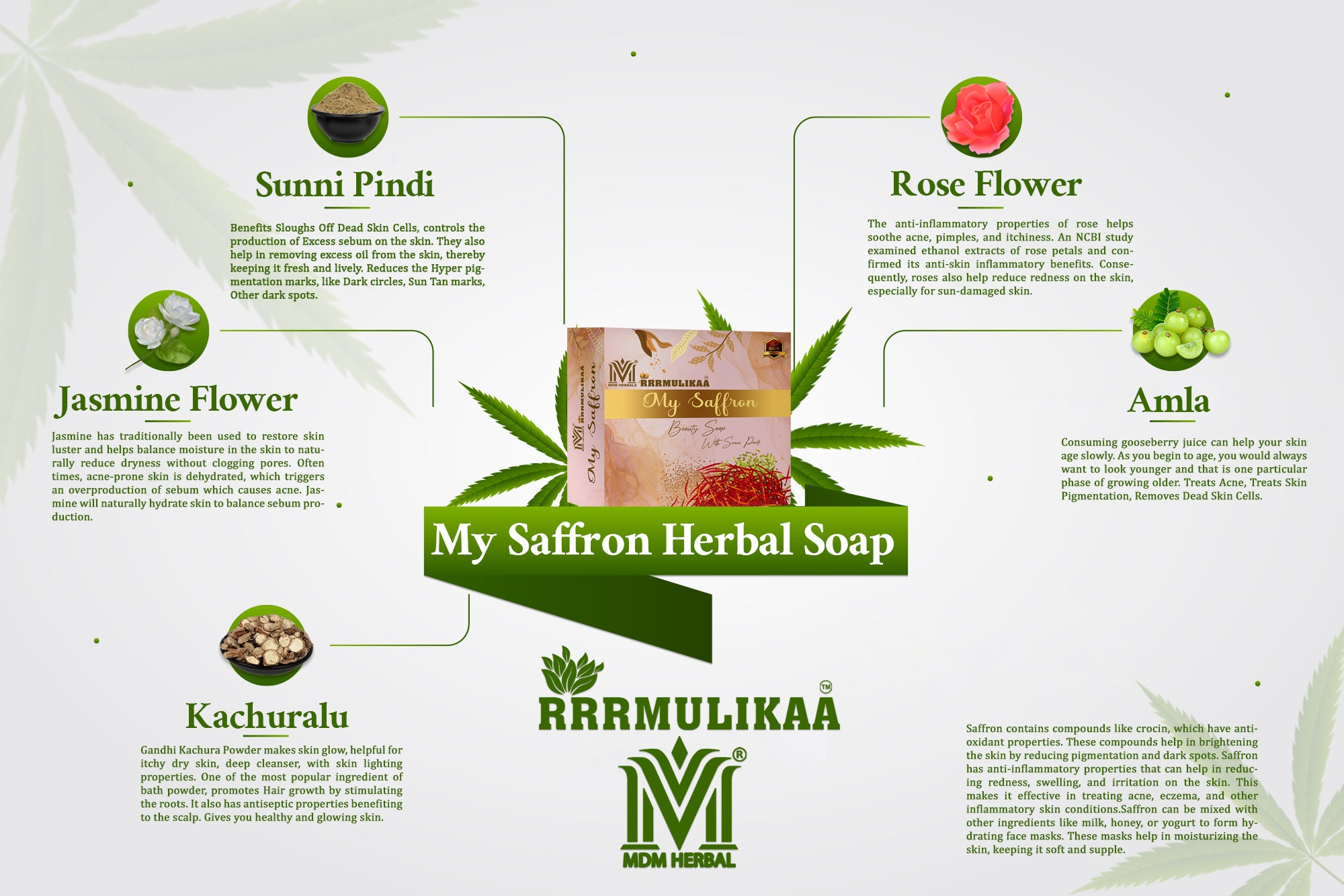 Saffron , Sunnipindi, Rose, Jasmine , Kachuralu, Glycerin, Amla